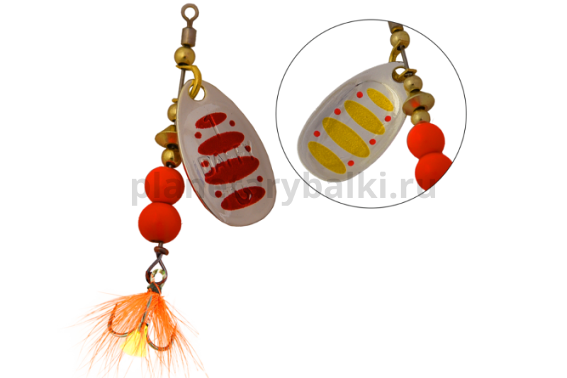 Приманка оснащена тройниками с мушкой. Это позволяет решить сразу несколько задач: выполняется маскировка тройника, осуществляется стабилизация задней части блесны при проводке и, самое главное, мушка служит дополнительной изюминкой для привлечения хищника.