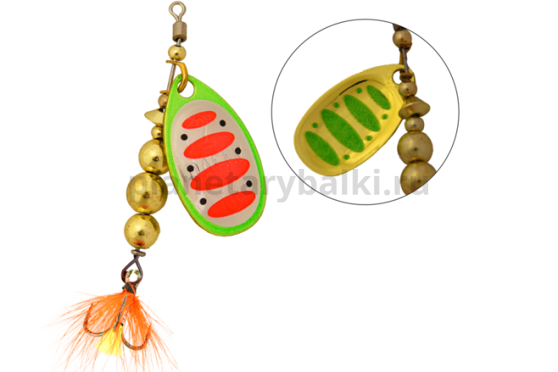 Приманка оснащена тройниками с мушкой. Это позволяет решить сразу несколько задач: выполняется маскировка тройника, осуществляется стабилизация задней части блесны при проводке и, самое главное, мушка служит дополнительной изюминкой для привлечения хищника.