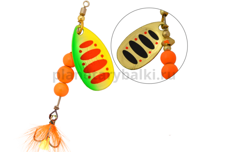 Daffy - вращающаяся блесна с широким лепестком, который при вращении отклоняется от оси на угол 50-55 градусов, что позволяет использовать эту приманку как на течении, так и в стоячей воде.