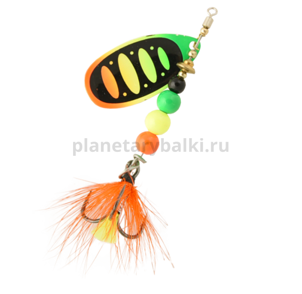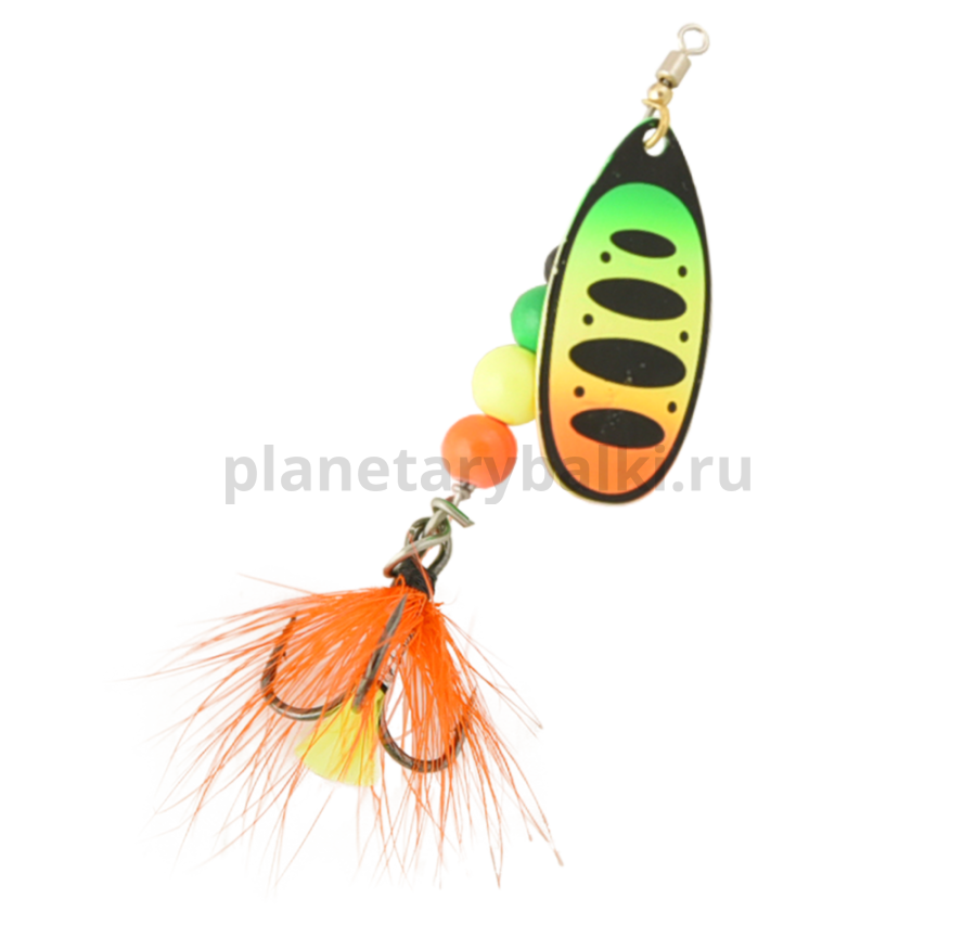 Приманка оснащена тройниками с мушкой. Это позволяет решить сразу несколько задач: выполняется маскировка тройника, осуществляется стабилизация задней части блесны при проводке и, самое главное, мушка служит дополнительной изюминкой для привлечения хищника.