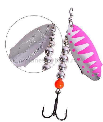 Вращающаяся блесна «Камчатка» имеет весьма крупные габариты. Лепесток имеет вытянутую форму и небольшой угол отклонения – около 30 градусов. Такая компоновка блесны обеспечивает хорошую игру приманки на сильном течении. Сердечник выполнен в виде шариков, окрашенных в яркие флуоресцентные цвета, что хорошо имитирует икру лососевых рыб.