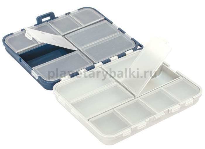 Рыболовная коробка из полипропилена. Устойчива к воздействию масел, силиконов и растворителей, предназначена для хранения вертлюжков, застежек и т.д. Обтекаемая форма повышает удобство эксплуатации. Имеет две поверхности, которые оборудованы восемью маленькими отсеками и восемью средними с прозрачными крышками. Оснащена ушком для крепления и закрывается на защёлку.