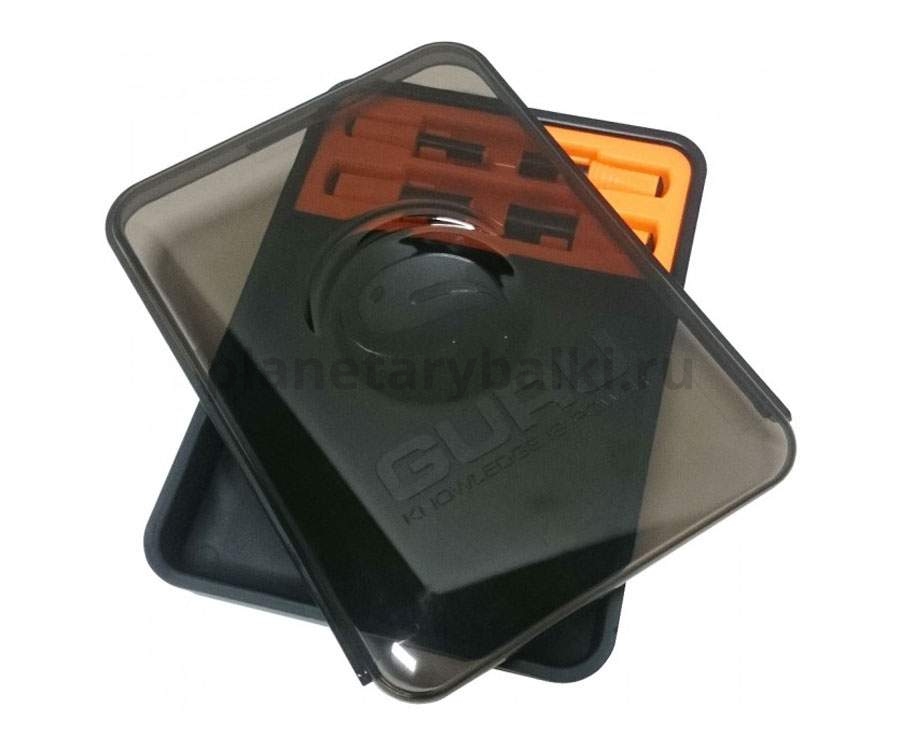 КоробкаGuru Punch Box - плоская и компактная, легко помещается в отделениях педаны. Закрывается на выдвижную крышку (выдвигается при помощи одной руки) защищенную от воздействия UV лучей. Наживки, хранящиеся в коробке, не будут сохнуть под воздействием солнца. Снизу изделия размещаются две рыжие полосы, которые не позволят соскальзывать коробке с наклонных поверхностей. Внутренне пространство разделено на два отделения. Первое для хранения наживок. Второе для хранения поршней, которые закрепляются в специальных пазах.