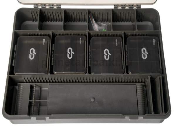 Carp Pro Large Tackle Box – пластиковый кейс-органайзер, созданный специально для хранения и транспортировки рыболовной фурнитуры, аксессуаров, готовых монтажей и комплектующих оснасток, используемых в карповой ловле. Набор состоит из кейса, 8 маленьких коробок с крышками, поводочницы, позволяющей хранить как стандартные поводки, так и длинные поводки для оснастки Zig-Rig, а также 20 иголок для фиксации поводков. Основной кейс имеет три больших продольных отсека, которые можно разделить при помощи съёмных перегородок (6 больших и 5 малых) на ячейки нужной величины, формируя внутреннее пространство согласно своим потребностям.