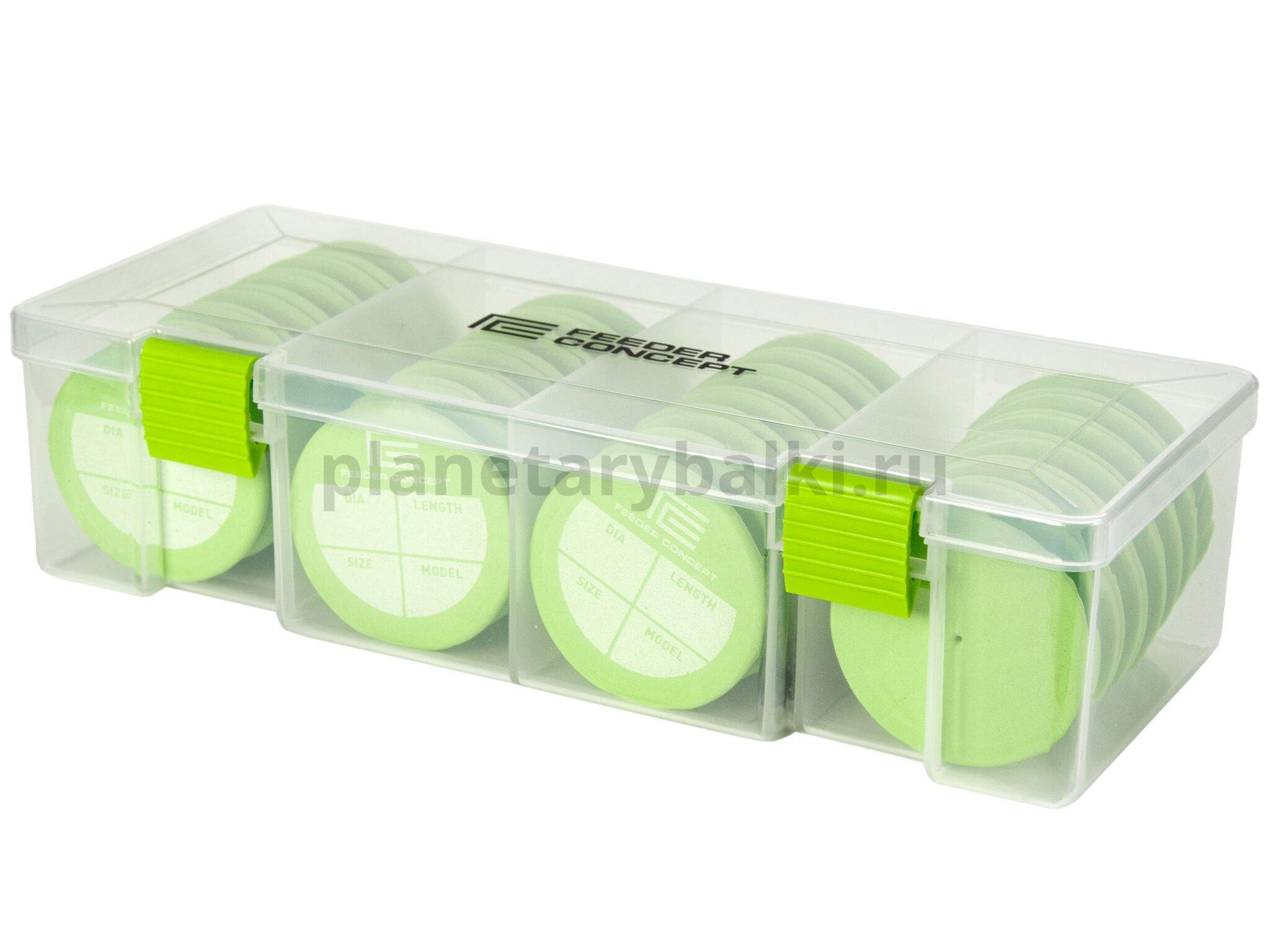 Пластиковая коробка с круглыми мотовилами из материала EVA для хранения и транспортировки готовых фидерных поводков. В коробке находятся 24 мотовила диаметром 65мм, каждое мотовило укомплектовано булавкой для фиксации поводка. Хранение поводков на мотовилах круглой формы более предпочтительно, так как в этом случае поводок всегда остаётся ровным, и на нём не появляются "заломы", что характерно для мотовил другой формы.