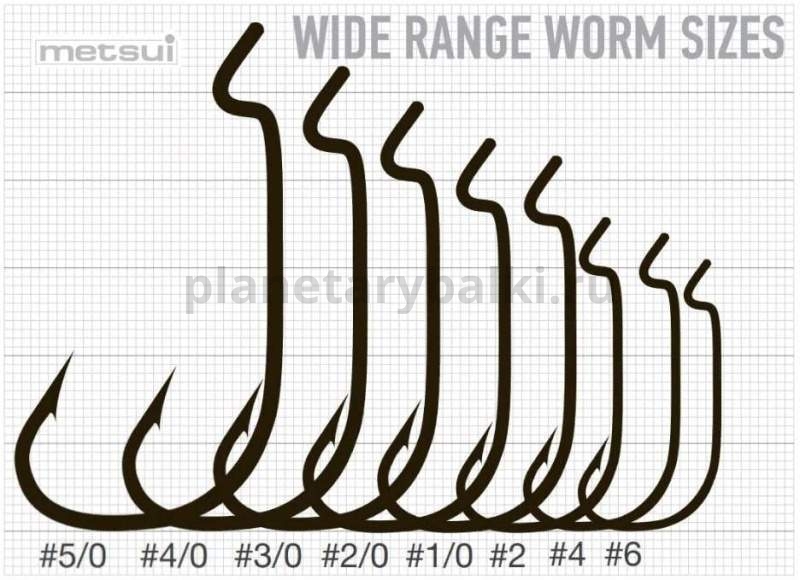 Metsui Wide Range Worm - офсетные крючки с широкой формой скошенного загиба, укороченным цевьем с «правильным» Z-изгибом ступеньки. Крючки используются в каролинской и техасских оснастках при ловле на мягкие силиконовые приманки, в том числе и на достаточно объемные. Крючки имеют темное, очень стойкое, антикоррозийное покрытие и чрезвычайно остры.