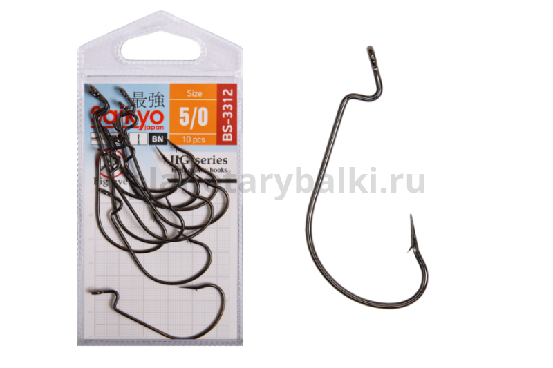 Крючок BS-3312 идентичен крючку BS-2312, но отличается большим ушком, благодаря которому его не заклинивает на арматуре шарнирных грузил. Заточка по принципу игольного жала (Niddle point). При проводке приманка движется более свободно и естественно. Средняя толщинат проволоки. Крючки Saikyo BS-3312 используются в классическом джиге и во многих других оснастках: поводковые, техасские, каролинские, Drop-shot. Форма Wide Gap применяется для резины разной жесткости и формы.