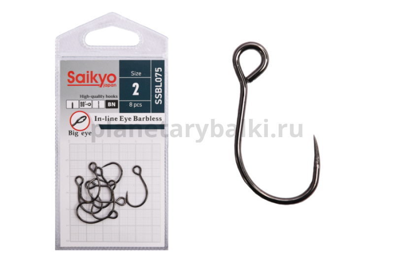 Крючки Saikyo SSBL075-BN IN-LINE EYE BARBLESS №2, 8шт.