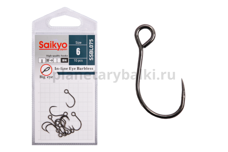 Крючки Saikyo SSBL075-BN IN-LINE EYE BARBLESS №6, 10шт.