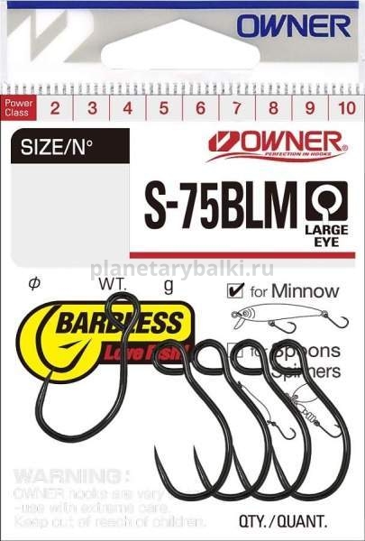 Owner S-75BLM 51626 для оснащения вращающихся и колеблющихся блесен. Крючки отличает повышенная прочность и надежность при вываживании рыбы. Характеризуются цевьем нормальной длины, круглым загибом, острейшим жалом с зацепистой бородкой и стойким к коррозии покрытием Black Chrome