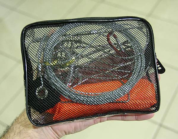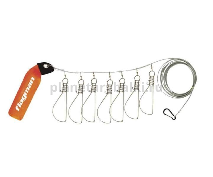 Набор мощных куканов с пружинными фиксаторами. Каждый кукан прикреплен к стальному тросу посредством вертлюга. Куканы свободно перемещаются по тросу, благодаря чему для закрепления очередного трофея не нужно извлекать из воды весь улов. На тросе с одной стороны присутствует карабин для крепления, а с другой – специальный поплавок. Длина троса – 6 метров. Поставляется в прозрачном непромокаемом чехле.