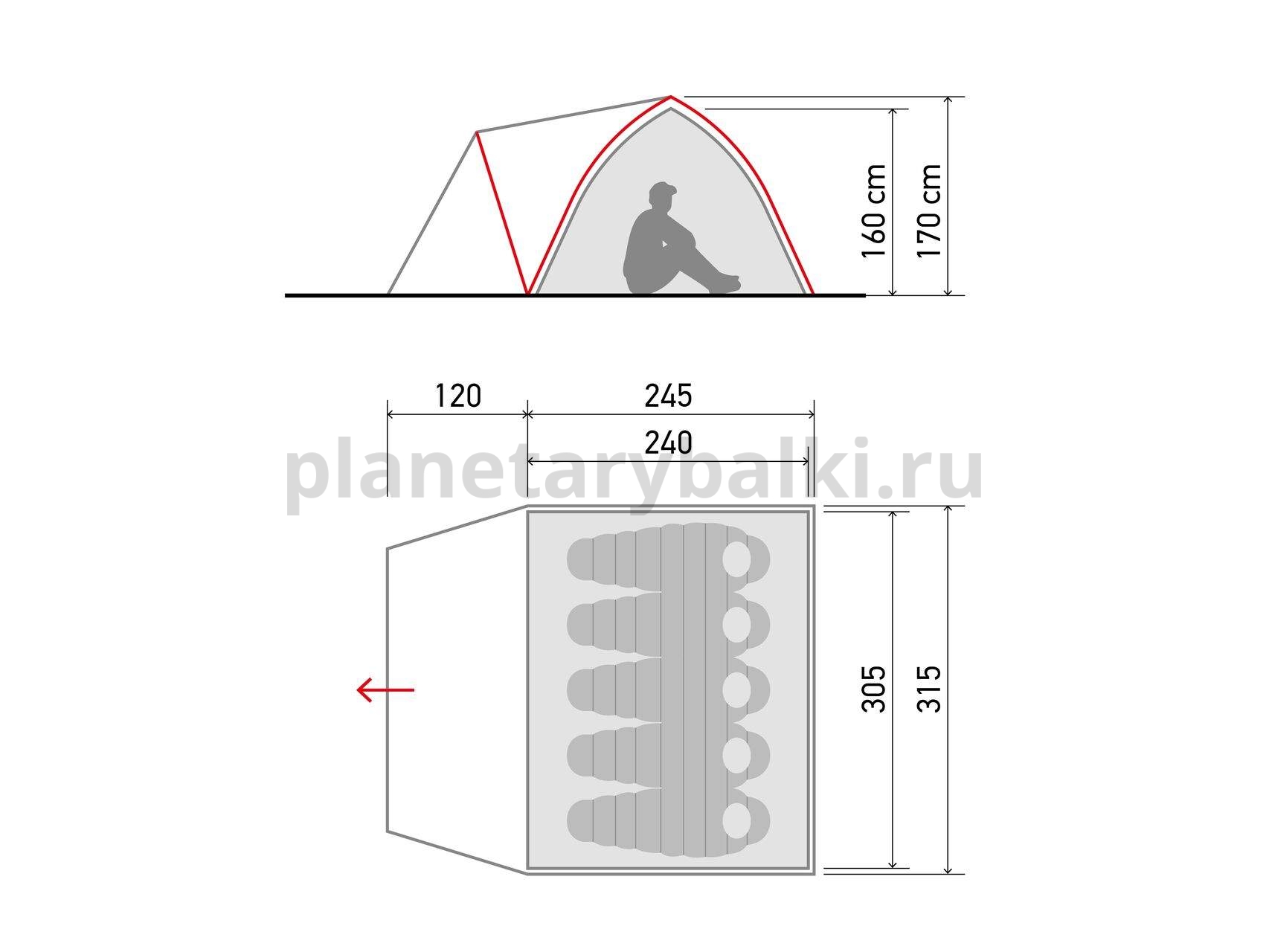 5-ти местная кемпинговая палатка с полуавтоматическим быстро сборным каркасом. Удобная просторная спальня, тамбур для хранения вещей. Пол в тамбуре, ветрозащитная юбка - создадут комфорт и защиту в непогоду.