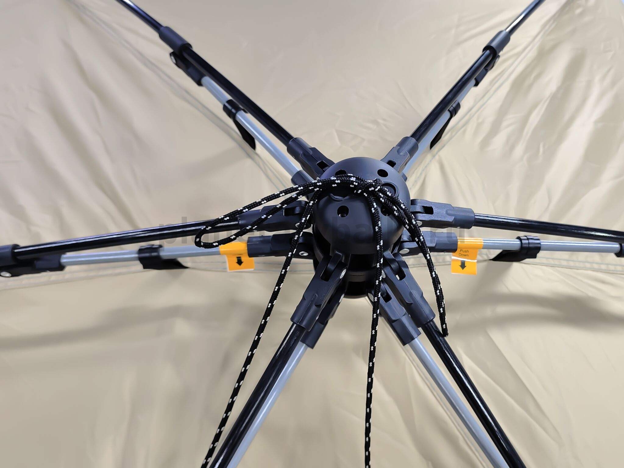 Палатка выполнена из легких и прочных материалов. Использование светлого материала исключает чрезмерное нагревание купола палатки, способствуя созданию комфортного микроклимата внутри и продлевая срок службы палатки. Специально обработанные ткани не только держат ультрафиолетовые лучи, но также препятствуют появлению неприятных запахов.