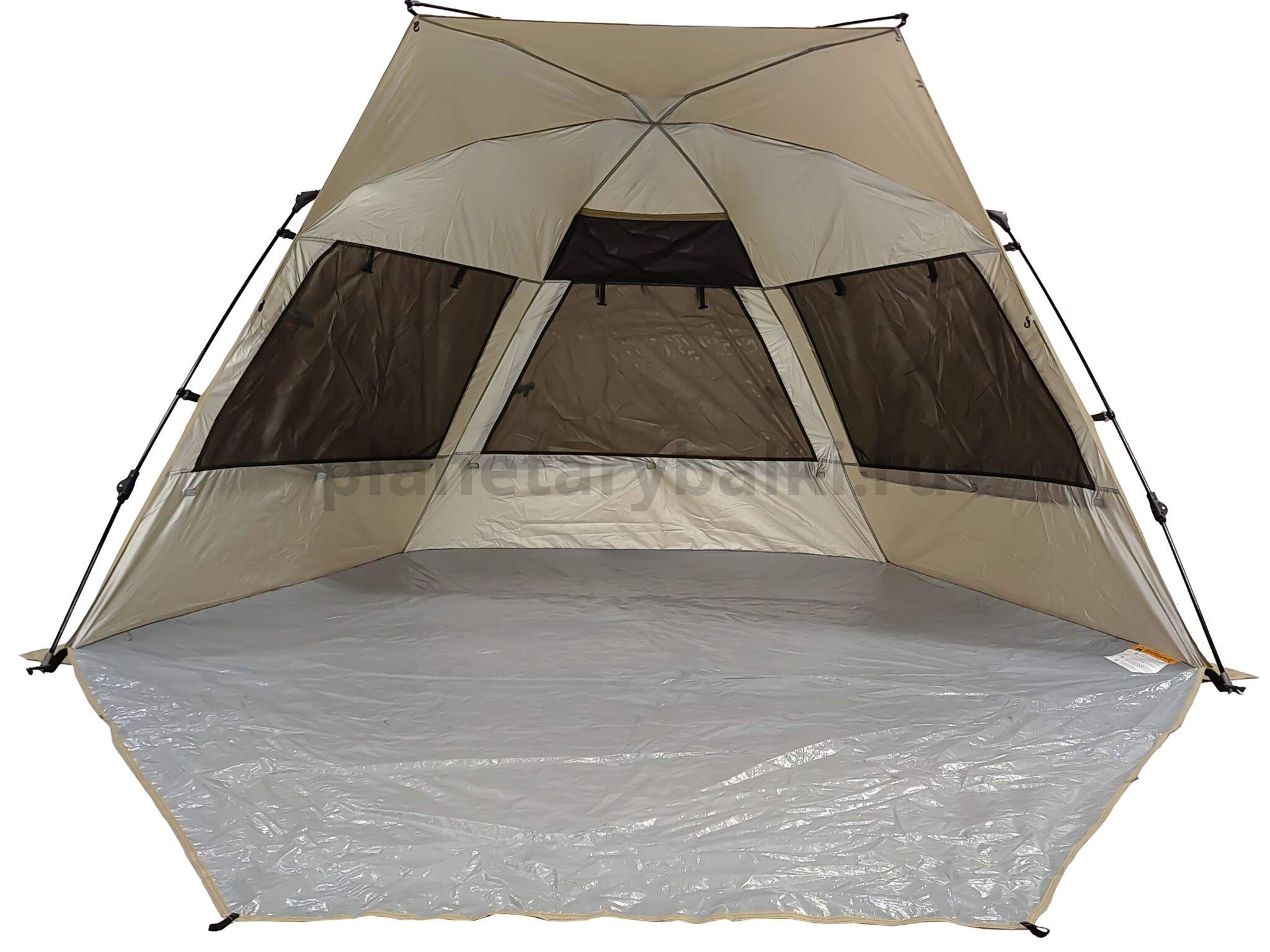 Широкие панорамные окна по периметру палатки создают условия для максимально эффективной вентиляции. Окна оборудованы шторками, что позволяет регулировать интенсивность циркуляции воздуха в палатке, один вход.