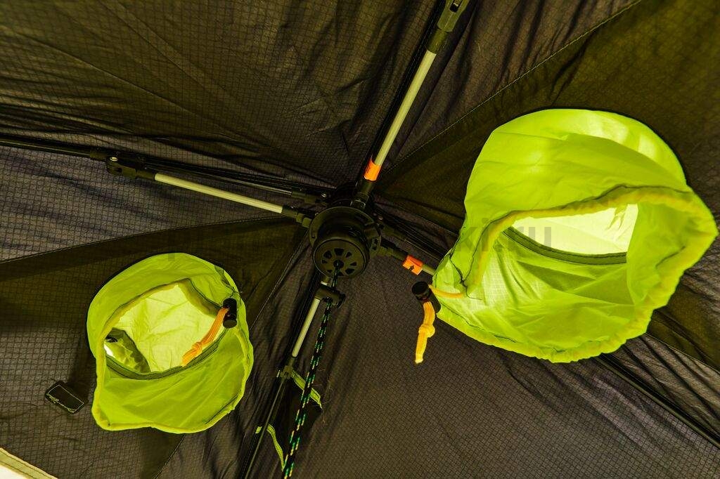 Чёрная крыша нагревается при солнечном свете, обеспечивая тепло в зимний период. Белые стены на уровне глаз- не будут создавать нагрузки на глаз, обеспечивая естественный комфортный свет внутри. Яркий зеленый низ палатки и светоотражающие элементы - сделают палатку яркой и заметной в темное время суток.