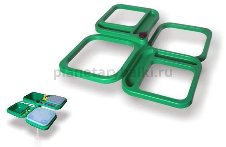 Рыболовный складной столик Stonfo с центральным резьбовым креплением. Столик совместим с двумя малыми (11х11см) контейнерами и двумя большими (14х14см) контейнерами. Универсальная резьба подходит ко всем видам стоек.